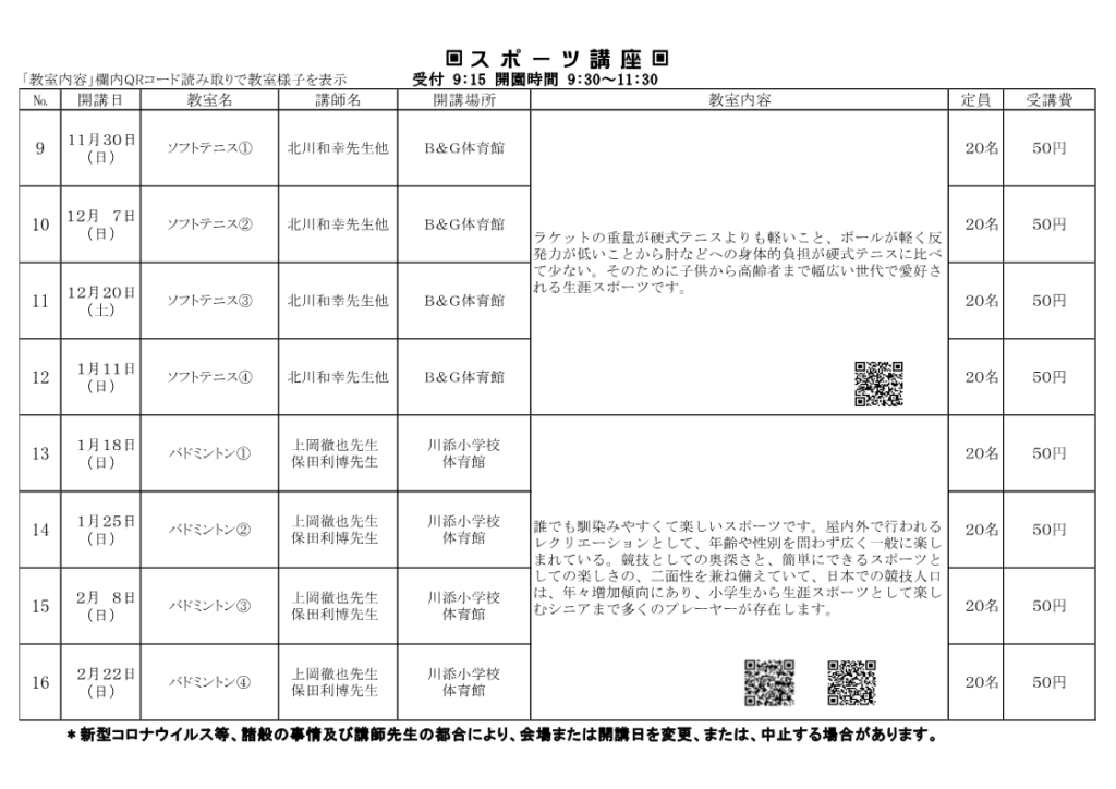 | 12月 7日(日)「ソフトテニス➁教室」 | 1月25日(日)「バドミントン②教室」 |