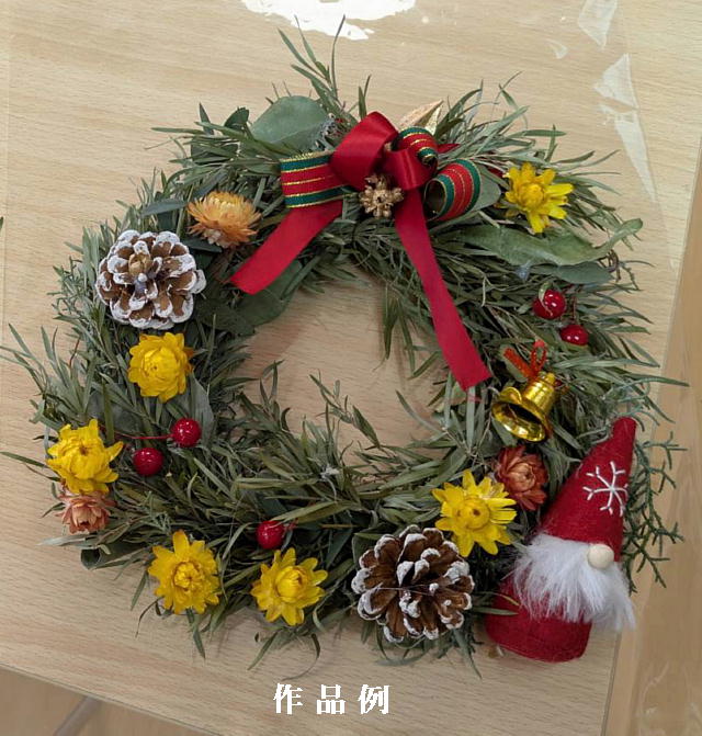 針葉樹や木の実など自然素材、ドライフラワーなどふんだんに使って、世界にひとつだけのクリスマスリースを作る教室です。当日追加は出来ません。